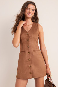 - Sleeveless - V-Neck - Button Up Front - Faux Suede - Front Pockets - Materials: 95% Polyester, 5% Spandex - Models are approximately 5’10” and wear a size small - Imported